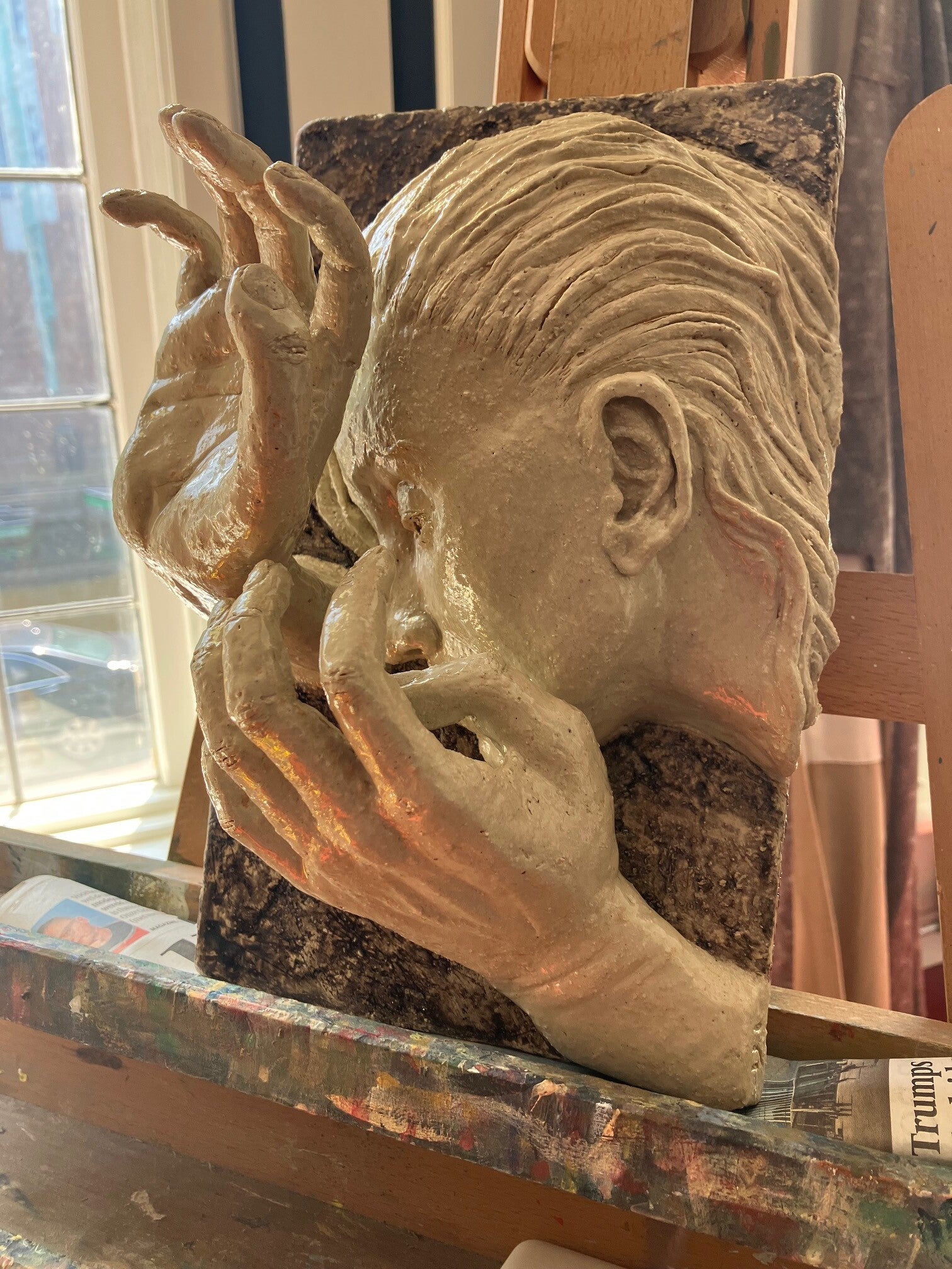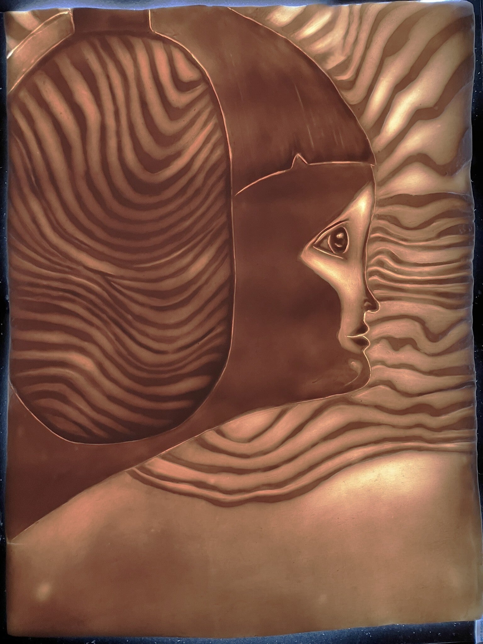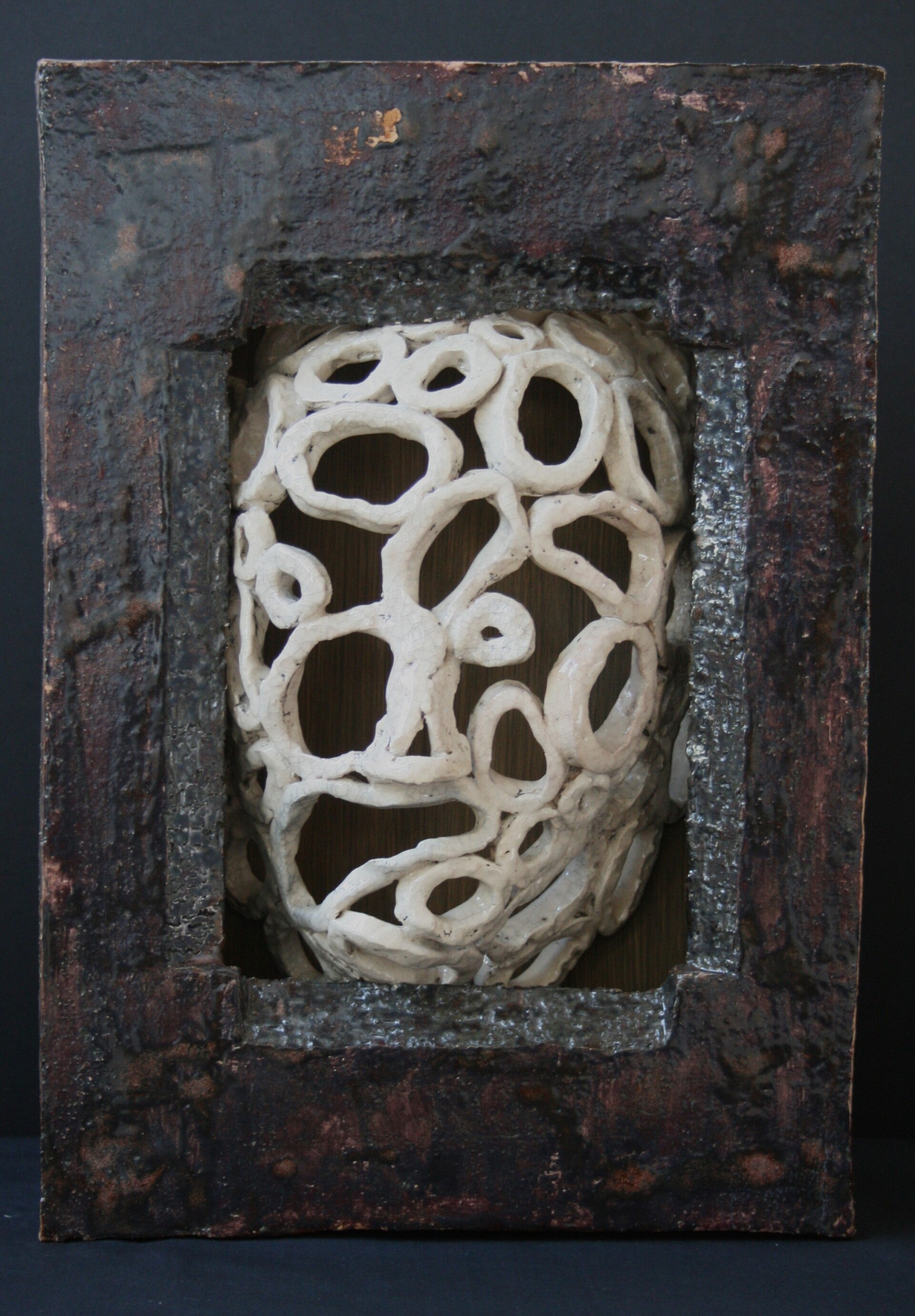 Steengoed, Terra sigillata. Ingewikkeld met diverse bladeren, bloemen, koperdraad. voor de Saggar stook